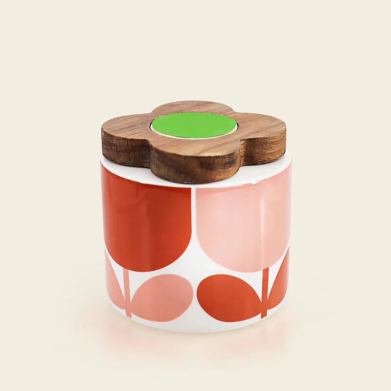 Perfect compliment to any Orla Kiely tea set. The little sugar bowl is printed with Orla’s iconic Block Flower design in a vibrant tomato & pink colourway. Complete with wooden lid, this 100% ceramic sugar bowl is a charming retro addition to your home.